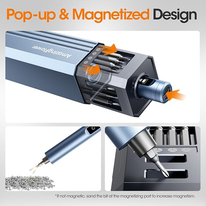 - 【What’s In The Box】1 electric screwdriver, 42 precision S2 bits, 1 Type-C charging cable, 1 magnetic storage case, 1 tweezer, 1 pry bar, and 1 user manual. Just a heads-up: the charging adapter isn’t included.