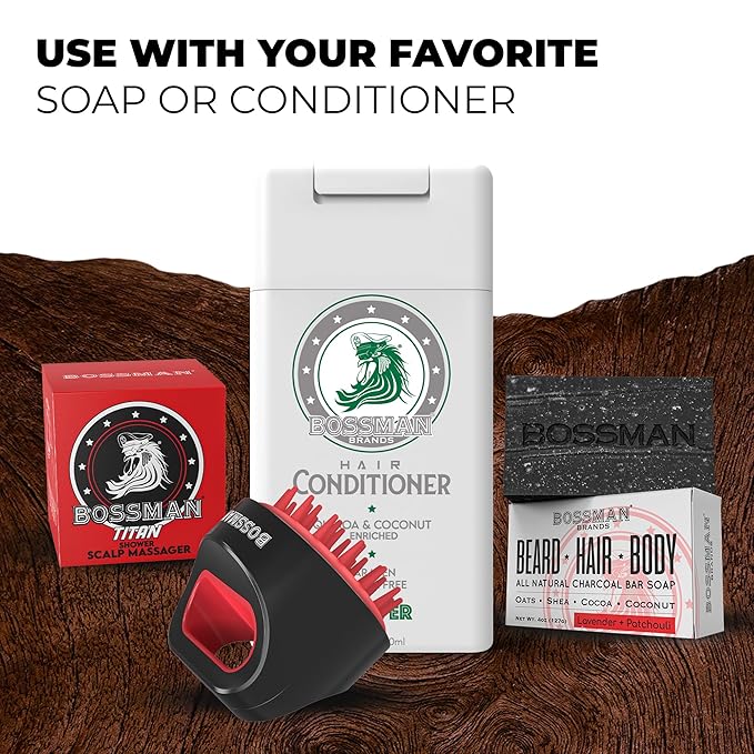 - Applies products evenlApplies Products Evenly: Transform hair care routine with Bossman precision-engineered shampoo scalp massager which will enhance hair care products' performance and effectiveness. Designed to complement Bossman Shampoo and 4-in-1 Bar Soap, this scalp scrubber for shower optimizes hydration and nutrient absorption. Let this manual scalp massager lead the charge in your grooming arsenal.