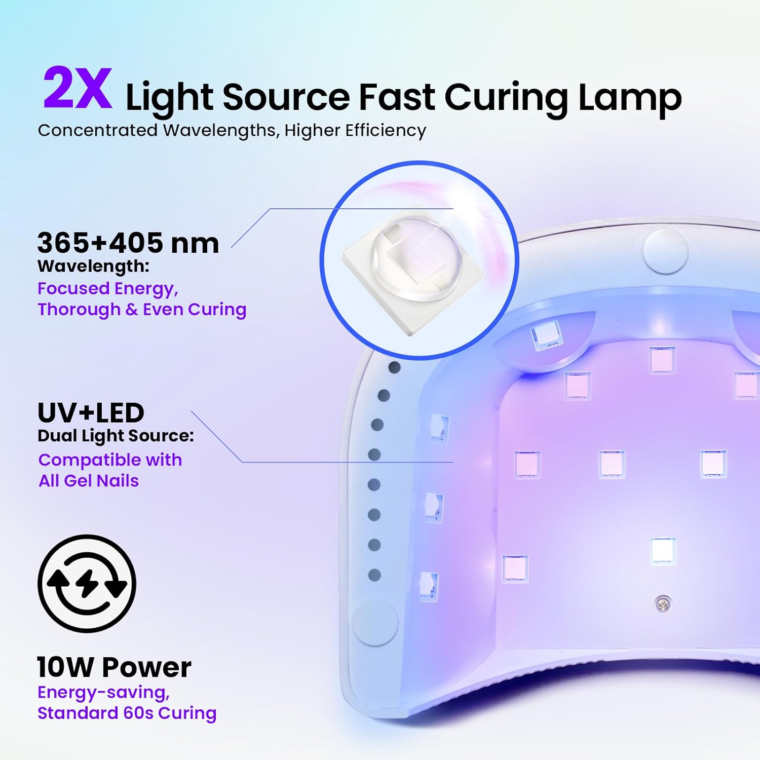 - Easy to use & Friendly to Beginners: Our products can help you complete the entire process of manicure. With high-performance technology, our Nail Lamp can quickly cure various gel nail polish and base coat all-round uniform. The automatic sensor on the lamp controls the light, turning on/off the light when you insert/unplug your hand, effectively saving energy and the lamp has a longer service life. In addition, this nail kit includes other tools you may need for nail removal.