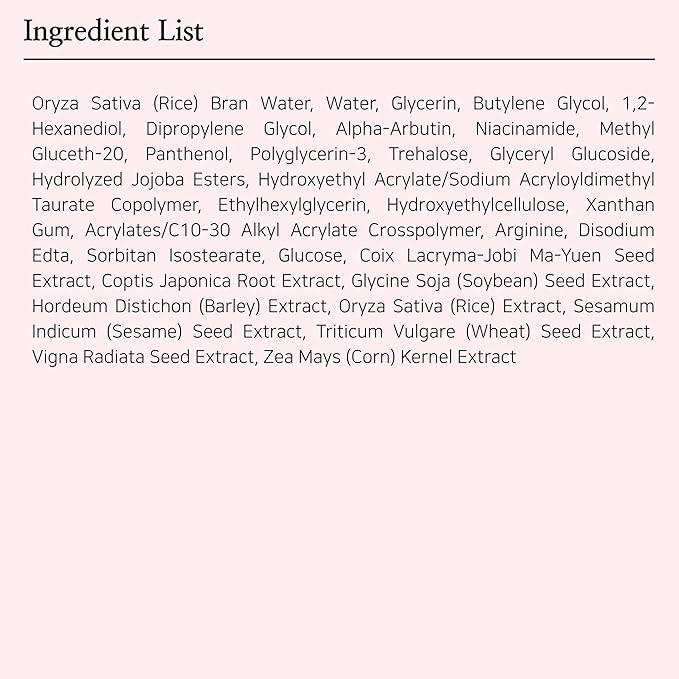- Key Ingredients: Rice Water 68%: Moisturizing, hydration. Alpha-Albutin 2%: Radiance, skin protection and pigmentation. Niacinamide: Skin tone, skin barrier and acne care.