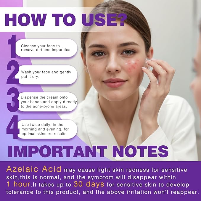 - Enhances Skin Tone and Texture: Formulated to address imperfections, our 14% Azelaic Acid Cream improves uneven tone and blemishes, revealing a more radiant and balanced complexion.