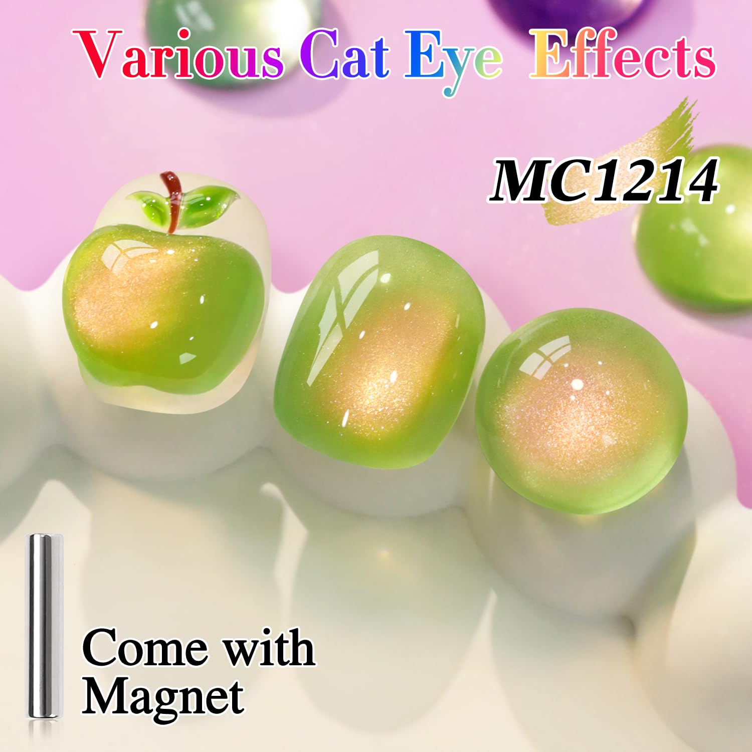 Double Rhythm 0.5 OZ Cat Eye Gel Polish with Magnet 15ML Holographic Glitter Shimmer Translucent Jelly Color Magnetic Nail Polish Salon DIY at Home (Green Pink-MC1214)