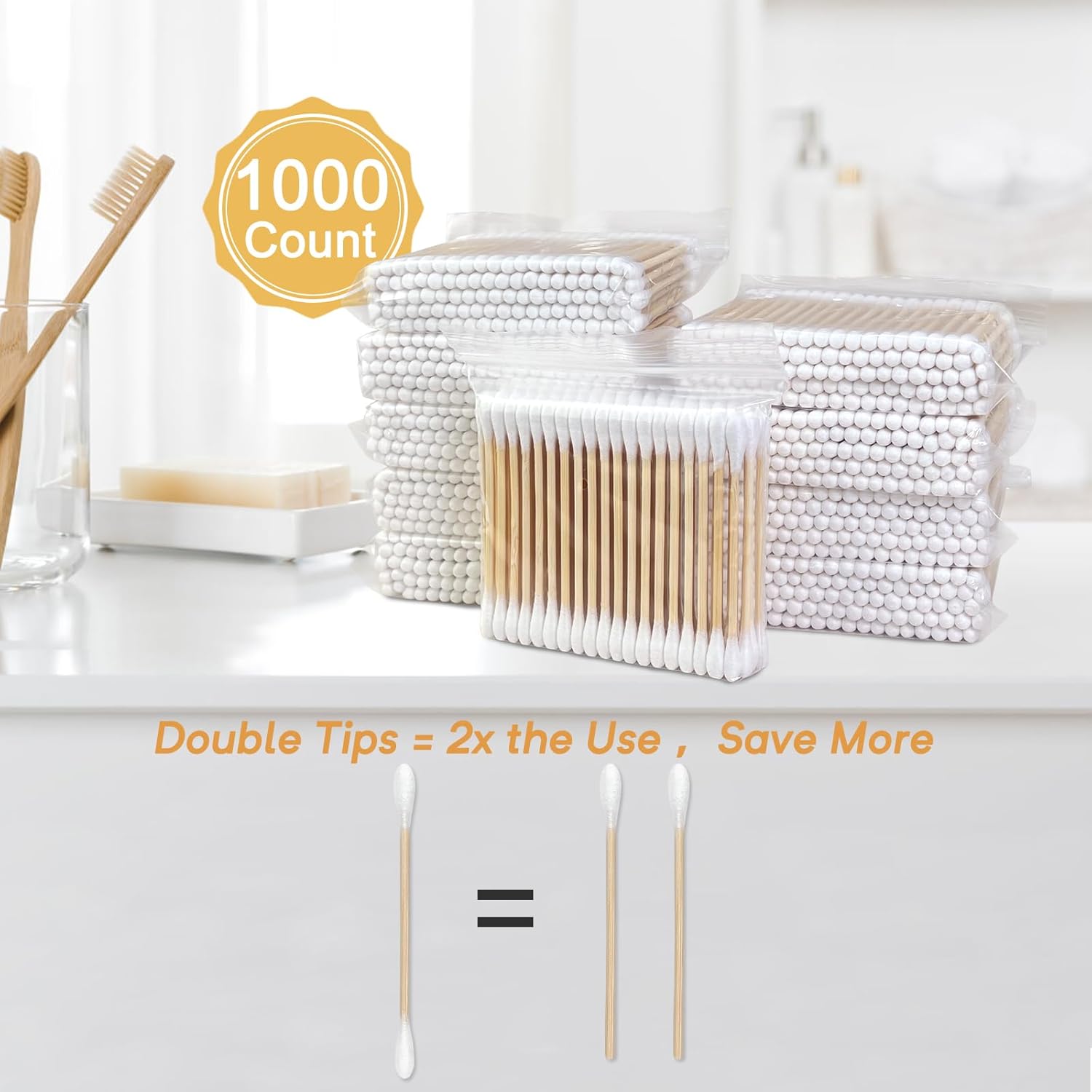 Bamboo Cotton Swabs 1000 Count in Storage Box, Double-Tipped Organic Cotton Buds with Durable Bamboo Sticks, for Makeup, Ear Care, Cleaning, Crafts