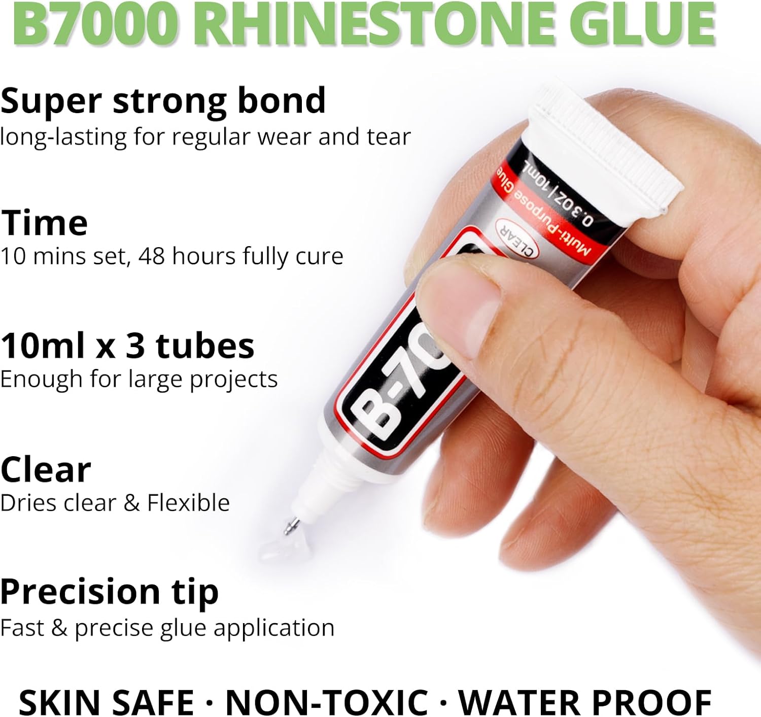 - B7000 Clear Glue for Gemstones -- B7000 glue has strong adhesion and dries clear, waterproof when dried, non-toxic and harmless to the skin. The glue has a precision needle for easy application, they can be applied precisely