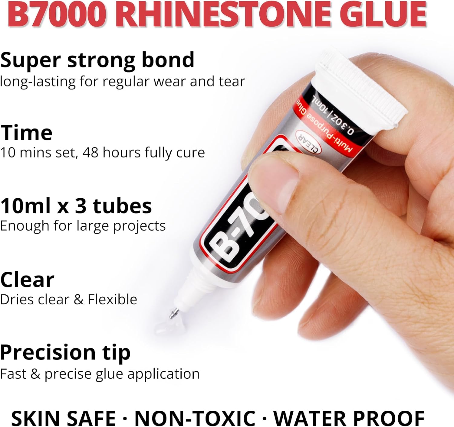 - B7000 Clear Glue for Gemstones -- B7000 glue has strong adhesion and dries clear, waterproof when dried, non-toxic and harmless to the skin. The glue has a precision needle for easy application, they can be applied precisely