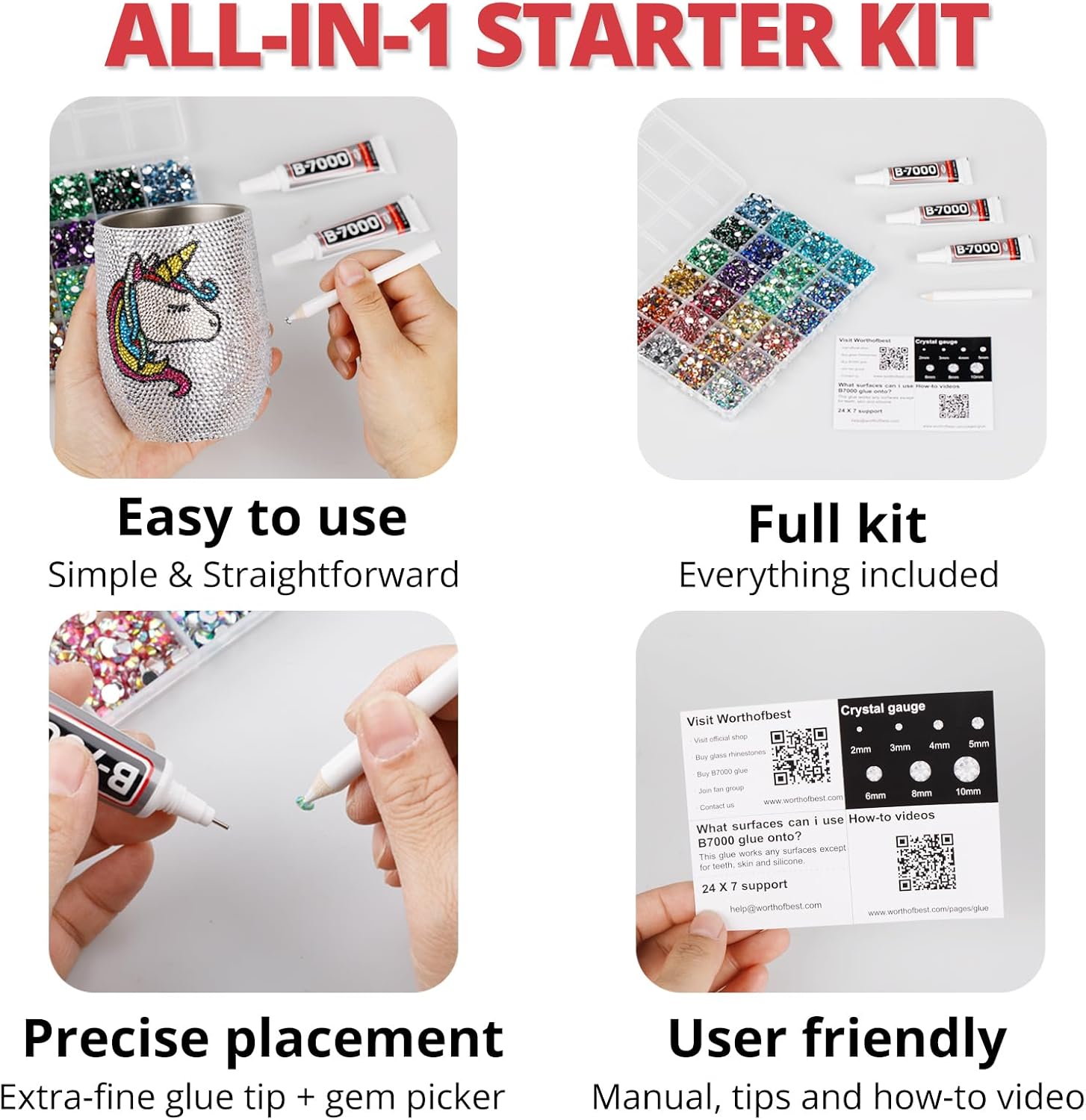 - Easy to Use -- This kit is designed to be straightforward, and versatile for various crafting projects. The manual is user-friendly and beneficial for both novice and experienced crafters. The complete and durable tools are suitable for precisely applying rhinestones to create intricate designs, with no additional tools required. Rhinestones are easy to apply and remove. The sturdy container with 24 grids keeps all rhinestones organized by size and color, making them easy to store and access