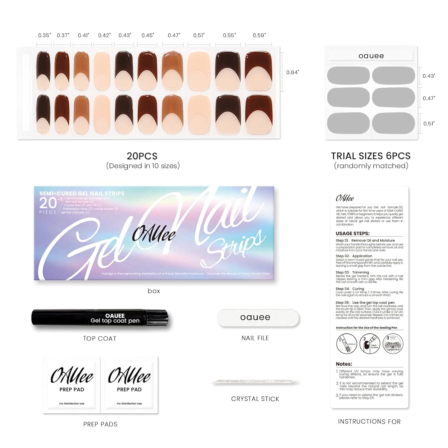 - Innovative Gel Nail Strips: Nail gel strips are made from 100% real gel nail polish ingredients, not plastic material. Through its expertise, OAUEE presents semi-curing gel nail strips, made with an innovative formula that comfortably fits all types of nail sizes and shapes and achieves a perfect aesthetic look for your nails!