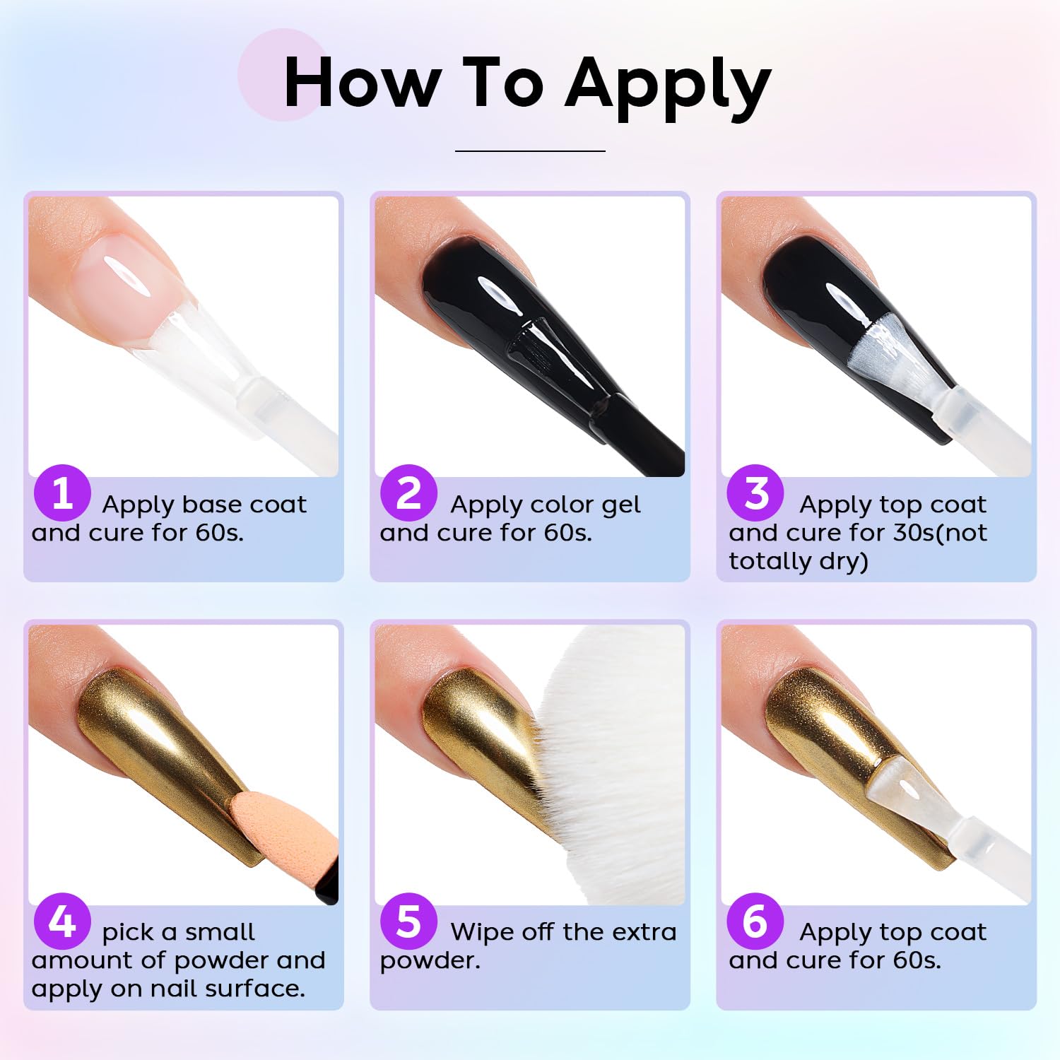 - Package Included: 6 Jars Nail Powder with 6 pcs eyeshadow sticks. Needs to be used with gel nail polish and no wipe top coat for chrome powder, which is not included in this kit.