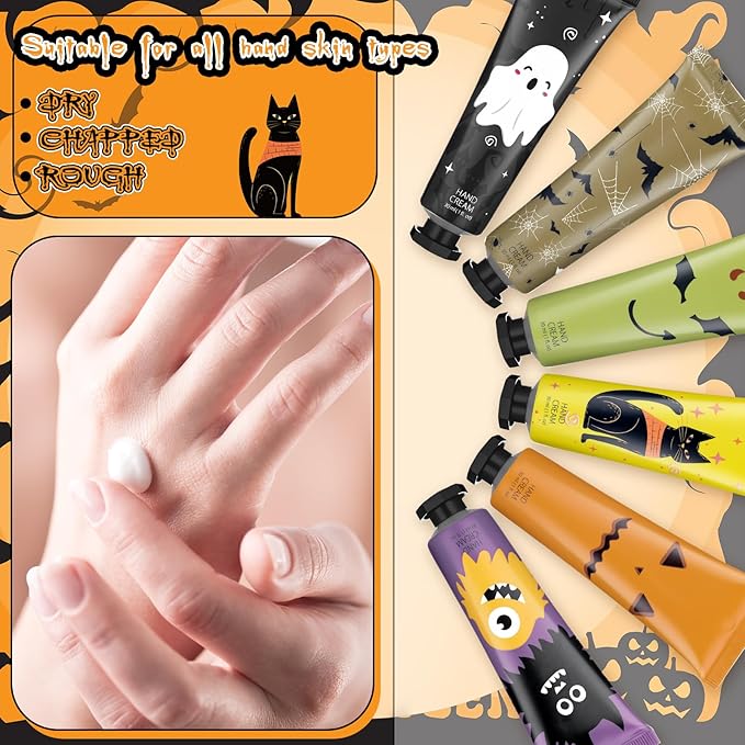 - Halloween Design: our Halloween hand lotions feature vibrant, festive designs with classic holiday elements such as ghosts, bats, pumpkins, and black cats; With bright colors and eye-catching packaging, they add a fun and lively touch to any Halloween celebration; Ideal as party favors, trick-or-treat giveaways, or fillers for Halloween goodie bags