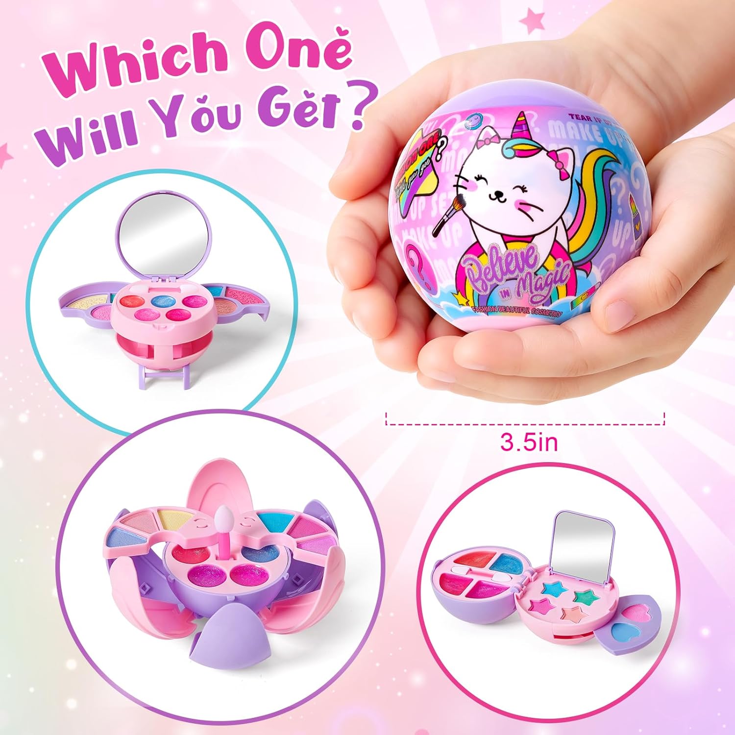 - 3 Distinct Styles to Discover: Each ball contains 1 of 3 different mini kids makeup sets. Open a randomly picked makeup blind ball and you will get: 6 colors of eye shadow, 4-5 colors of lip gloss for girls, a tiny sponge blusher, and a small mirror for portable touch-ups (2 models equipped). Find out which one you will get and enjoy the surprise fun