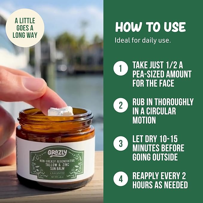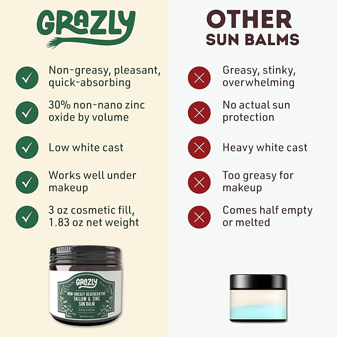 - SMOOTH, NON-GREASY APPLICATION: Grazly’s beef tallow & non-nano zinc sun balm absorbs easily into the skin without leaving a greasy or sticky feel. The non-nano zinc oxide is blended for an even texture, and the balm applies smoothly, with no white cast or residue. It provides sun protection while offering a lightweight, comfortable feel, making it suitable for daily use. The formula is designed to work well under makeup, providing an even and non-chalky finish.