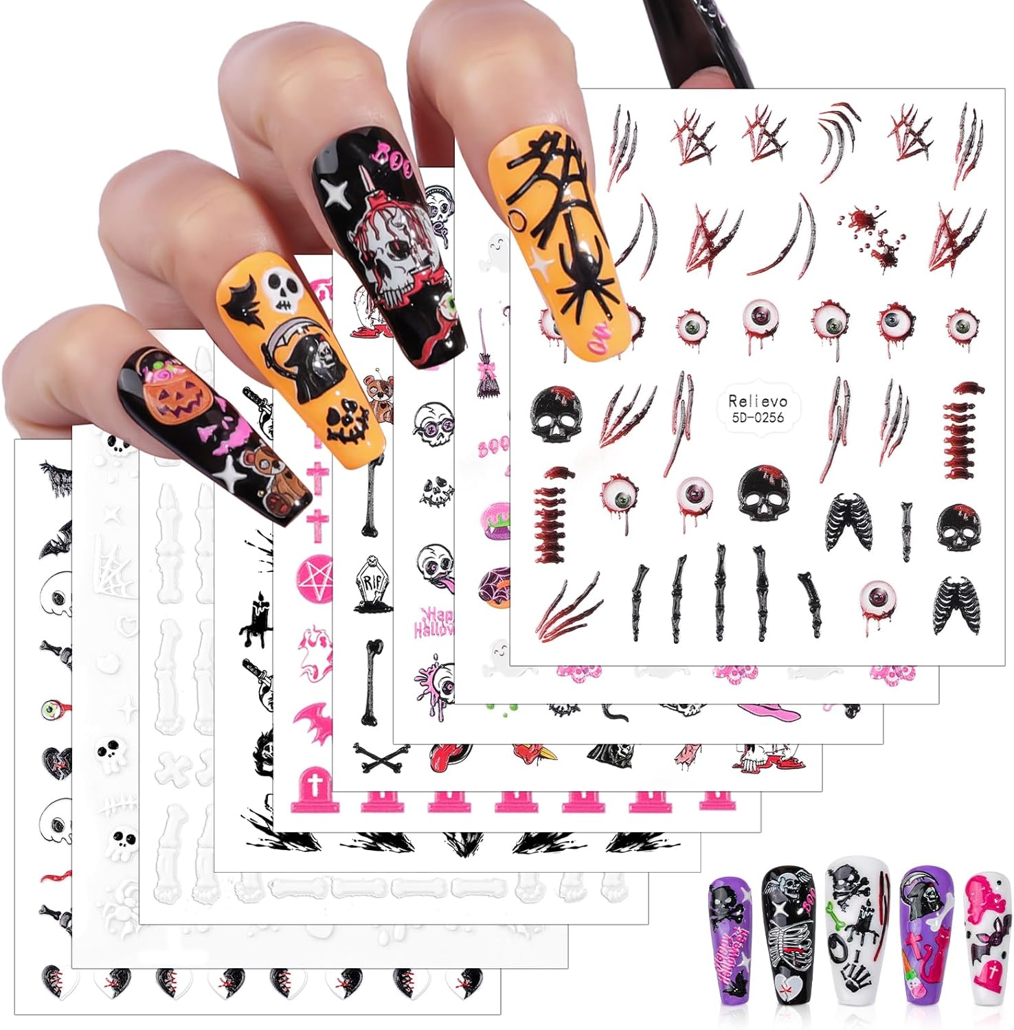 - 🎃 Easy-to-Use Halloween nail supplies: Thanks to the self-adhesive backing, you don’t need any glue. Just tear off your favorite pattern, stick 5D stickers on your nails, and press gently for a few seconds. That’s all it takes to get unique, beautiful, professional-looking nail art.