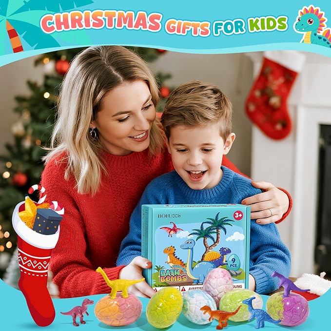 Dinosaur Bath Bombs for Kids with Surprise Inside, Christmas Stocking Stuffers for Kids, 9 Pack Bath Bombs Gift Set, Natural Organic Kid Bubble Bath Fizzy for Girls Boys with Bath Toys Inside