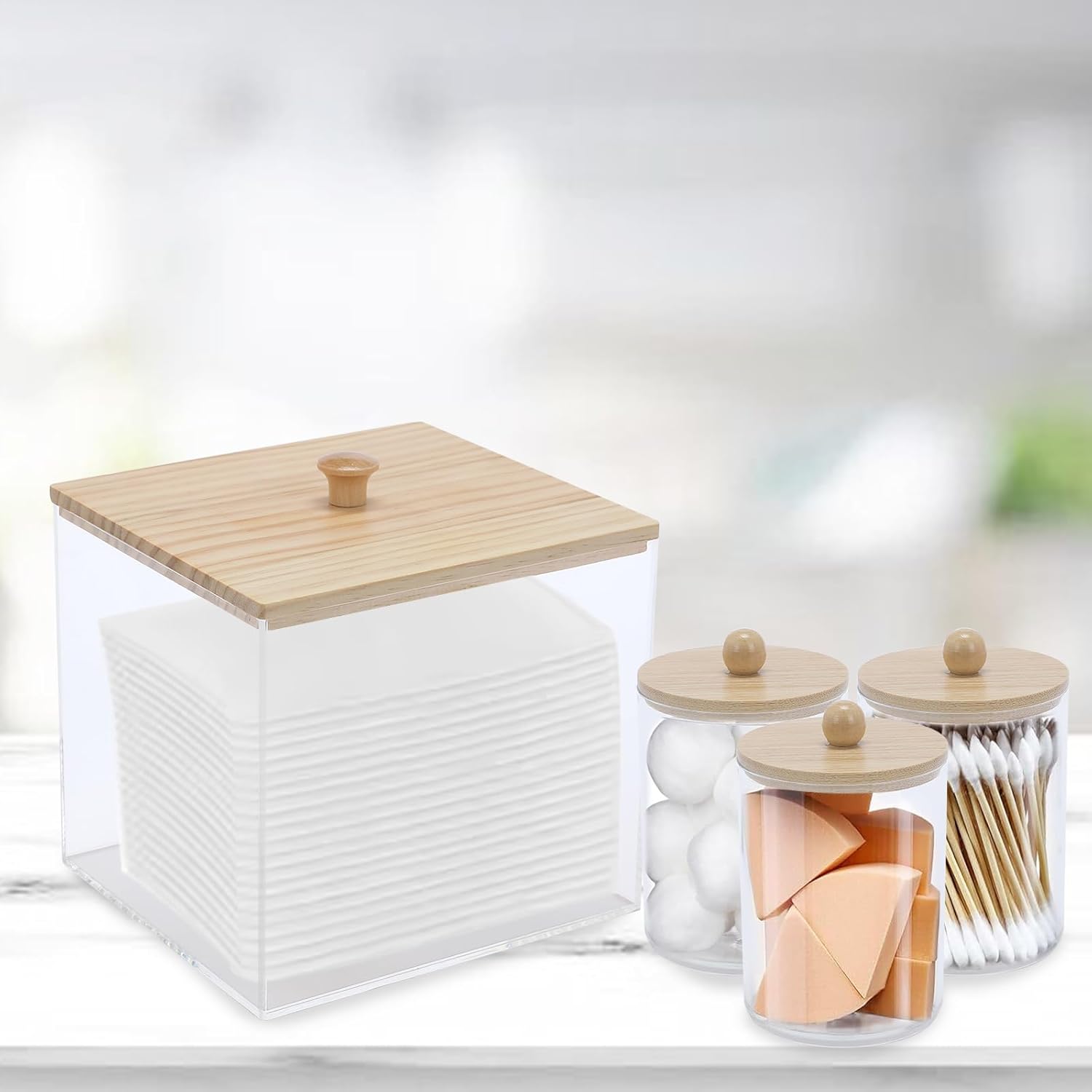 4 Pack Qtip Holder Dispenser with Bamboo Lids & Disposable Face Towel Holder Set, Clear Storage Bins for Facial Cloth, Vanity Makeup Storage Organizer, Bathroom Essentials Accessories Decor