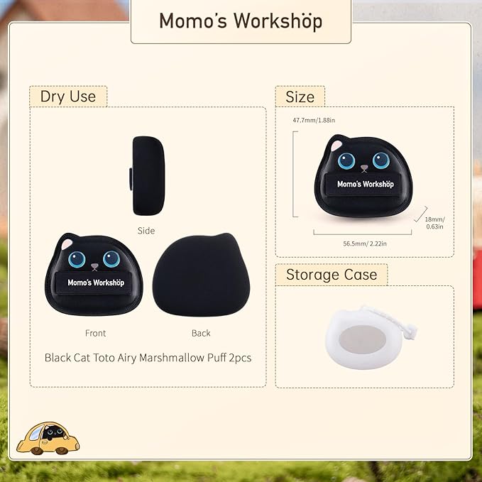 Black Cat Toto Airy Marshmallow Puff,Makeup Sponge,Rubycell Material,Pointed Tip for Concealer + Flat Side for Foundation, Longwear Makeup, Travel Friendly & Reusable,2pcs Puffs & Storage Case