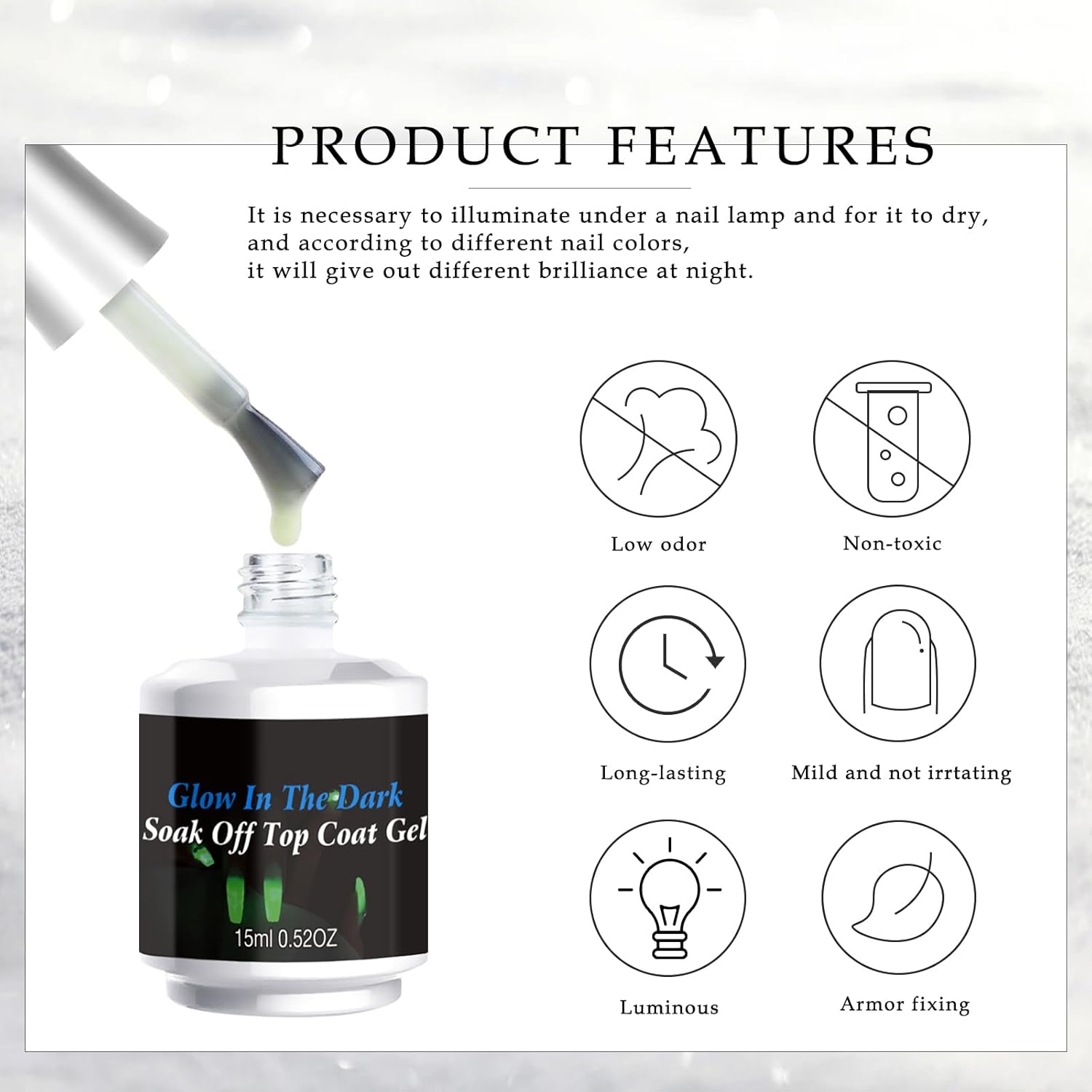 - 【Easy to Use】 Quickly elevate any manicure! Simply apply over your polish, cure under a lamp for 60-90 seconds, and enjoy beautiful, long-lasting luminous nails. Shake before use for optimal results and get ready to shine brightly at night.