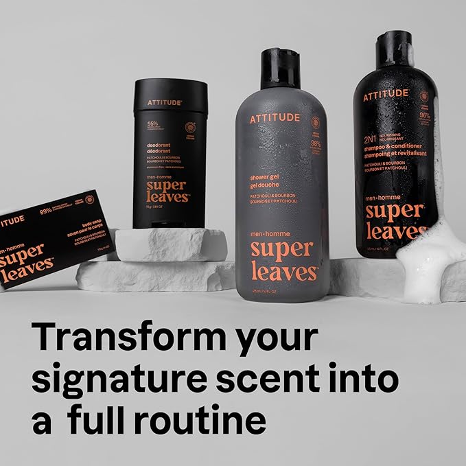 ATTITUDE Shower Gel Body Wash for Men, 98% Natural Origin Ingredients, Paraben & Phthalate Free, EWG Verified, Cleanses Without Drying, Patchouli & Bourbon, 14 Fl Oz (Pack of 3)